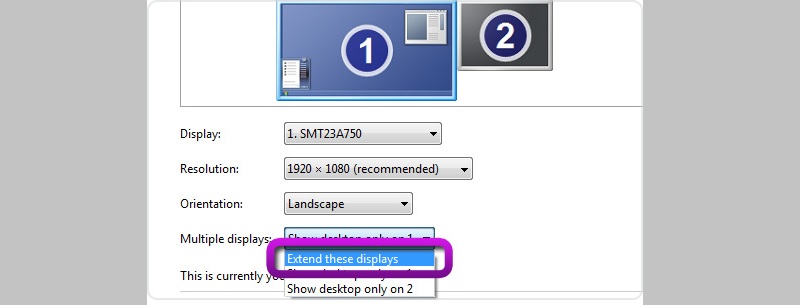 メジャーディスプレイを選択し、マルチディスプレイドロップダウンでこれらのディスプレイを拡張することを選択します。